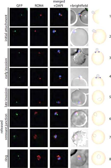 PfMyoB-GFP remains at the anterior of the merozoite during invasion of the host cell.MyoB-GFP-expressing P. falciparum parasites were fixed during various stages of invasion, then MyoBGFP (green) was revealed using rabbit anti-GFP antibodies, RON4 (red) was detected using mAb 24C6 and nuclei stained with DAPI (blue). Merged images including the DIC are shown, as well as a cartoon of the invasion stage in which the moving junction is shown by the blue arrowheads, the extracellular merozoite is grey, and the intracellular parasite is denoted by a dotted line and is uncoloured. The invasion steps have been divided into initial attachment, followed by early and late stages of invasion as well as the final steps of invasion with the release of the remnant junction and formation of the ring stage. Scale bar: 2 μM.Yusuf NA, Green JL, Wall RJ, Knuepfer E, Moon RW, Schulte-Huxel C, Stanway RR, Martin SR, Howell SA, Douse CH, Cota E, Tate EW, Tewari R, Holder AA. The Plasmodium Class XIV Myosin, MyoB has a Distinct Subcellular Location in Invasive and Motile Stages of the Malaria Parasite, and an Unusual Light Chain. J Biol Chem. 2015 Mar 23.
