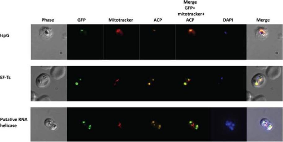 Expression and localization of Kae1api interaction partners. Representative IFA images from RFA-tagged parasites are shown. IspG (top row), EF-Ts (middle row), and a putative RNA helicase (bottom row) co-localize with an apicoplast marker (ACP) and not with mitochondria. Mitochondria and nuclei were visualized with Mitotracker and DAPI-DNA stain, respectively. IFAstudies confirmed the apicoplast localization of all three proteins.Mallari JP, Oksman A, Vaupel B, Goldberg DE. Kinase-Associated Endopeptidase 1 (Kae1) Participates in an Atypical ribosome-Aassociated complex in the apicoplast of Plasmodium falciparum. J Biol Chem. 2014 Sep 9 [Epub ahead of print]