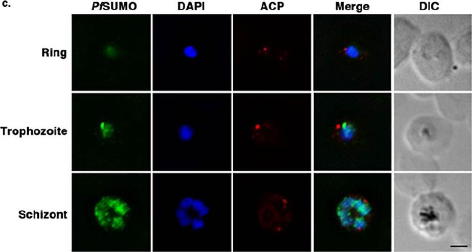 Sumoylation is differentially regulated during P. falciparum red blood cell stages. Indirect immunofluorescence microscopy of synchronized 3D7 parasites probed with anti-PfSUMO mAb 7E11 and anti-ACP antibodies. DNA was detected using DAPI. Bar indicates 2 μm. SUMO was concentrated in the nucleus of parasites at all three stages, with no discernible association with Maurer’s clefts. Consistent with immunoblot analysis, levels of detectable SUMO signal were greatest in trophozoite and schizont stage parasites.Reiter K, Mukhopadhyay D, Zhang H, Boucher LE, Kumar N, Bosch J, Matunis MJ. Identification of Biochemically Distinct Properties of the Small Ubiquitin-related Modifier (SUMO) Conjugation Pathway in Plasmodium falciparum. J Biol Chem. 2013 Sep 27;288(39):27724-36. -