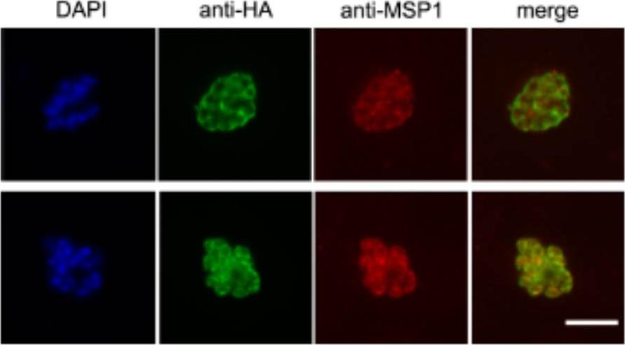 PfROM4 is a merozoite plasma membrane protein. IFA of mature nonsegmented (top) and fully segmented (bottom) schizonts of 3D7HAROM4synth (parasites with episomal expression of N-terminal HA3-tagged PfROM4, under the control of the pfrom4 promoter), dual labeled with mAb 3F10 (anti-HA; green) and mAb 1E1 (anti-MSP1; red). The DAPI signal (blue) is not included in merged images for clarity. Bar, 5 μm.O'Donnell RA, Hackett F, Howell SA, Treeck M, Struck N, Krnajski Z, Withers-Martinez C, Gilberger TW, Blackman MJ. Intramembrane proteolysis mediates shedding of a key adhesin during erythrocyte invasion by the malaria parasite. J Cell Biol. 2006 174:1023-33.