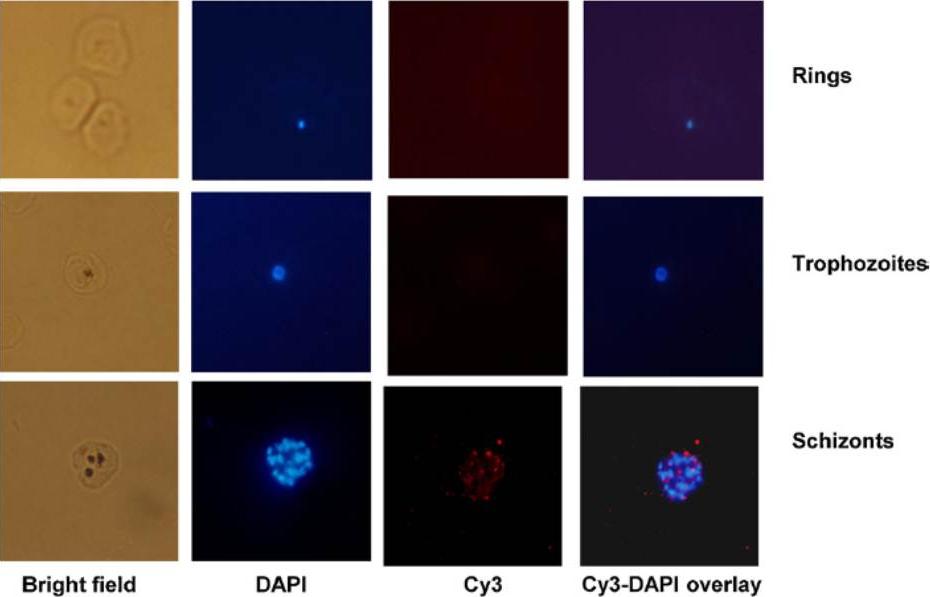Localization of PfSUB3 in the parasite by immuno-fluorescence assay. Immunofluorescent staining of ring, trophozoite and schizont stage parasites with anti-PfSUB3 antibody. Cy3-labeled anti-mouse IgG was used as secondary antibody and nuclei were counterstained with DAPI. Cy3 fluorescence signals were seen in schizont stage parasites. PfSUB3 accumulates in the parasitophorous vacuoleAlam A, Bhatnagar RK, Chauhan VS. Expression and characterization of catalytic domain of Plasmodium falciparum subtilisin-like protease 3. Mol Biochem Parasitol. 2012 183(1):84-9