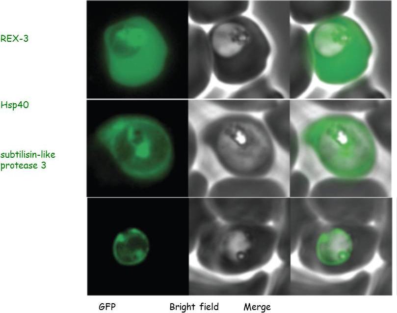 Parasites were transfected with the GFP chimeras of the 3 genes. Experimental verification of their sub-cellular localization indicated that REX-3 and Hsp40 were exported into the host cell cytosol while the protease accumulated in the parasitophorous vacuole.Sargeant TJ, Marti M, Caler E, Carlton JM, Simpson K, Speed TP, Cowman AF. Lineage-specific expansion of proteins exported to erythrocytes in malaria parasites. Genome Biol. 2006; 7(2):R12.
