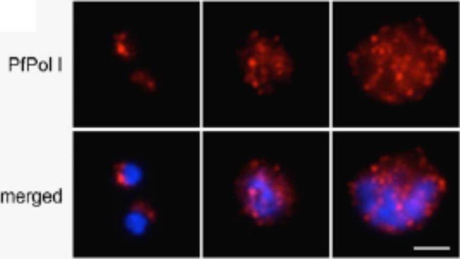 Immunofluorescence analysis of PfPol I (red). Ring-stage parasites show a half-moon perinuclear nucleolus. In trophozoites, PfPol I shows an additional diffuse pattern in the nucleoplasm and cytoplasm. In schizont segmented forms, PfPol I appears to relocalize at the nuclear periphery. Parasite nuclei are shown by DAPI staining (blue). (Scale bars, 2 μm.)Mancio-Silva L, Zhang Q, Scheidig-Benatar C, Scherf A. Clustering of dispersed ribosomal DNA and its role in gene regulation and chromosome-end associations in malaria parasites. Proc Natl Acad Sci U S A. 2010 107:15117-22.