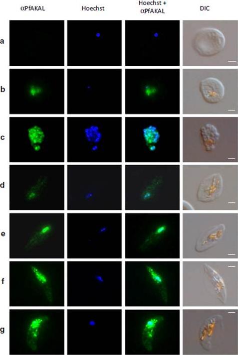 PfAKAL subcellular localizations in asexual and sexual P. falciparum blood stages. Images with PfAKAL localization (green), Hoechst DNA staining (blue), differential interference contrast (DIC) were taken on rings a trophozoites, b schizonts, c as well as on stage II, d stage III, e stage IV, f and stage V, g gametocytes, infected erythrocytes. “Bright orange” on DIC images indicates haemozoin crystals. The bars represent 2 μm. In asexual parasites PfAKAL was undetectable in ring stages (a), with expression predominantly in late trophozoites and schizonts. Interestingly, a diffuse subcellular localization of PfAKAL was observed in the parasite cytoplasm and in the nucleus in trophozoite stages, whereas it was mostly nuclear in schizonts (b, c). In sexual stages, PfAKAL was also detected in the cytoplasm of the parasite, although it mainly accumulates around the nucleus.Bandje K, Naissant B, Bigey P, Lohezic M, Vayssières M, Blaud M, Kermasson L, Lopez-Rubio JJ, Langsley G, Lavazec C, Deloron P, Merckx A. Characterization of an A-kinase anchoring protein-like suggests an alternative way of PKA anchoring in Plasmodium falciparum. Malar J. 2016 15(1):248.
