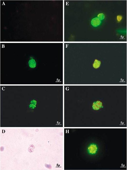 Different PfRabs have different sub-cellular distributions in schizont-infected erythrocytes. Panel (A) shows control rabbit pre-immune serum. Panel (B) shows a multinucleated schizont decorated with anti-PfRab1A antibodies giving a perinuclear staining. Panels (C) and (D) (phase contrast) show the pattern obtained with the anti-PfRab11A antibodies. Clearly, PfRab1A and PfRab11A display different distributions. Panel (E) shows the pattern obtained with anti-Pf39 (ERC) antibodies specific for the endoplasmic reticulum. Panel (F) shows a double-labelling with anti-PfRab1A (green) and Pf39 (red) antibodies, where colocalization stains yellow. Panel (G) shows a double-labelling with anti-PfRab11A (green) and anti-Pf39 (red) and no co-localization is observed. Panel (H) shows anti-PfRab6 (green) and anti-Pf39 (red), where co-localization stains yellow.Quevillon E, Spielmann T, Brahimi K, Chattopadhyay D, Yeramian E, Langsley G. The Plasmodium falciparum family of Rab GTPases. Gene. 2003 306:13-25.