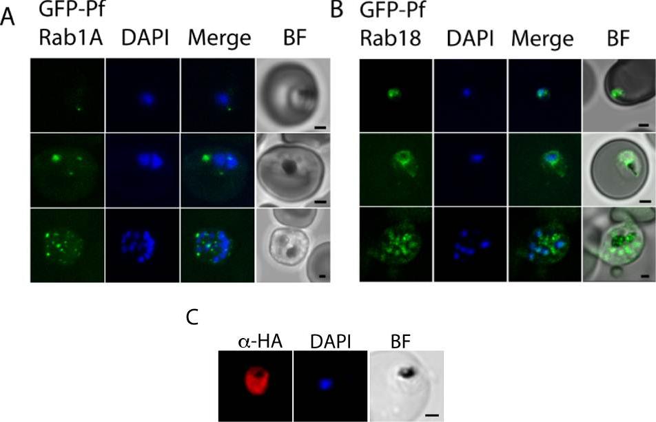 GFP-PfRab1A fluorescence in late schizonts is associated with rhoptry markers. Rhoptry markers Rap1 and Ron4 are found in trophozoites and schizonts as discrete foci that colocalize with GFP-PfRab1A fluorescence in late schizonts, but not in earlier phases of parasite development.Morse D, Webster W, Kalanon M, Langsley G, McFadden GI. Plasmodium falciparum Rab1A Localizes to Rhoptries in Schizonts. PLoS One. 2016 Jun 27;11(6):e0158174
