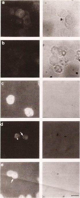 Localization of ATPase 1 by IFA. Abs to two regions of derived amino acid sequence from ATPase 1(anti-pep1 and anti-pep2) were applied to slides from isolate T9/96. Figures show dark filed (fluorescence) and bright filed views. Hemozoin pigment in bright field views corresponds to the location of parasitized red blood cells. a) Negative control (no FITC-conjugated Abs). b) negative control (no primary Abs). c) anti-Band 3 mAbs; d) anti pep1 Abs. e) anti-pep2 Abs. The arrows indicate fluorescence in the region of the parasite plasma membrane/parasitophorous vacuole, and the arrowhead indicates staining internal to the parasite. Bar: 10 mm.Krishna S, Cowan G, Meade JC, Wells RA, Stringer JR, Robson KJ. A family of cation ATPase-like molecules from Plasmodium falciparum. J Cell Biol. 1993 120:385-98.
