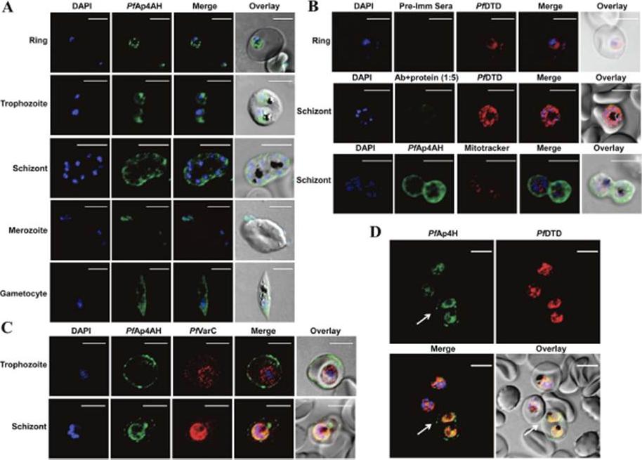 Spatial distribution of P. falciparum Ap4AH during erythrocytic schizogony. Shown are DAPI staining of nucleus in blue and PfAp4AH stained with Alexa 488 in green. (A) Confocal microscopy-data based spatial distribution of PfAp4AH in infected RBCs. PfAp4AH is non-nuclear in blood stages of the parasite and resides in its cytoplasm. (B) Non-mitochondrial localization with various controls is shown. Upper panel shows pre-immune serum (Pre-Imm Sera) control which does not stain the parasite or RBCs. Middle panel shows competitive binding of anti-PfAp4AH antibody to infected cells, where anti-PfAp4AH antibodies were incubated with recombinant PfAp4AH protein in 1:5 ratio. Pf D-tyrosyl-tRNATyr deacylase (DTD) is a cytoplasmic marker. Lower panel shows non-mitochondrial localization where mtochondria are stained in red. (C) RBC membrane localization of PfAp4AH during trophozoite and schizont stages of parasite. VarC is a marker for infected RBC membrane localization. (D) A field view of anti-PfAp4AH antibody staining of infected RBCs. Significant fraction of cells (~50%) showed membrane localization of PfAp4AH - here cell is marked with white arrow. Uninfected RBCs (without DAPI and PfDTD staining here) are unstained. White scale bar in confocal figures is of 5 μmSharma A, Yogavel M, Sharma A. Structural and functional attributes of malaria parasite diadenosine tetraphosphate hydrolase. Sci Rep. 2016 Feb 1;6:19981.