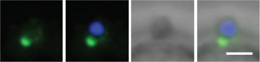 Schizont and merozoite culture was incubated overnight with 0.1µM cytochalasin D to inhibit invasion. Thin smeared on a glass slide, fixed in methanol, stained with Rabbit anti-formin1 polyclonal serum 1:300. Formin1 localizes to extreme apex of merozoite and follows tight junction (not shown).Baum J, Tonkin CJ, Paul AS, Rug M, Smith BJ, Gould SB, Richard D, Pollard TD, Cowman AF. A malaria parasite formin regulates actin polymerization and localizes to the parasite-erythrocyte moving junction during invasion. Cell Host Microbe. 2008 3:188-98. Copyright Elsevier 2009.