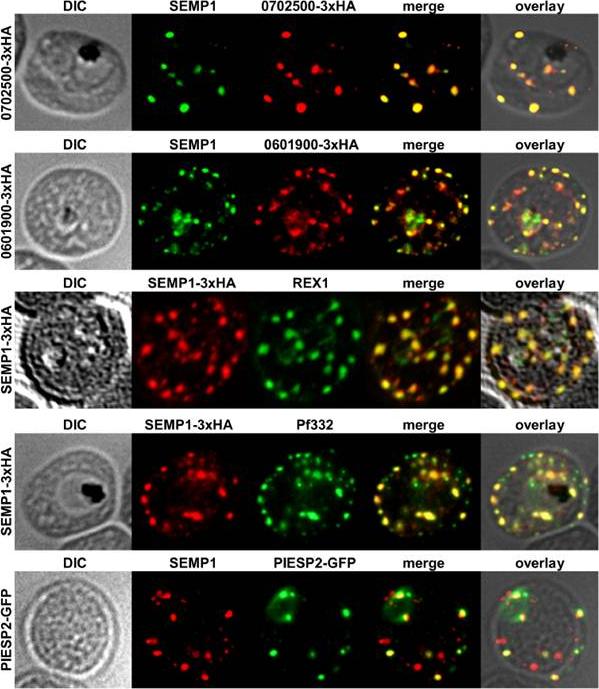Localization of potential SEMP1 interacting proteins. Immunofluorescence assays of MeOH-fixed RBCs infected with 3D7 expressing EMP1/PF3D7_0702500 (PF07_0008)/PF3D7_0601900 (PFF0090w) with a C-terminal 3xHA tag and 3D7 expressing PIESP2 with a C-terminal GFP-tag, co-labelled with mouse a-SEMP1 and rat a-HA (PF3D7_0702500-3xHA & PF3D7_0601900-3xHA) /a-GFP (PIESP2-GFP). For co-labelling of SEMP1-3xHA with REX1 and Pf332, rat a-HA and rabbit a-REX1 / mouse a-Pf332 antibodies were used. All potential interaction partners co-localized at least partially with SEMP1, but in particular with Pf332 or PIESP2 antibodies only a fraction of SEMP1 positive MCs were labelled with either antibody suggesting that distinct subpopulations of MCs exist. Dietz O, Rusch S, Brand F, Mundwiler-Pachlatko E, Gaida A, Voss T, Beck HP. Characterization of the Small Exported Plasmodium falciparum Membrane Protein SEMP1. PLoS One. 2014 9(7):e103272.