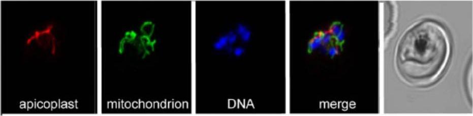 Synchronised ring-stage parasites expressing RFP targeted to the apicoplast (red) and YFP targeted to the mitochondria (green) . The nuclei were stained with Hoescht 33342 (blue) and viewed by confocal laser microscopy.PFL1590c is a nucleus-encoded mitochondrial-targeted EF-G protein involved in P. falciparum mitochondrial translation. PFF0115c is a nucleus-encoded apicoplast-targeted EF-G protein involved in P. falciparum apicoplast translation.Johnson RA, McFadden GI, Goodman CD. Characterization of two malaria parasite organelle translation elongation factor g proteins: the likely targets of the anti-malarial fusidic Acid. PLoS One. 2011;6(6):e20633.