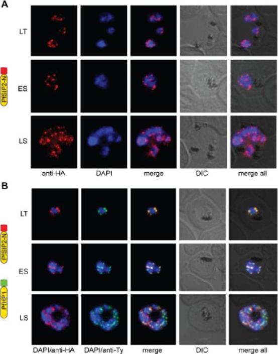 PfSIP2-N localizes to P. falciparum chromosome end clusters. (A) IFA detects discrete perinuclear PfSIP2-N-HA signals in late trophozoites (LT) and early (ES) and late (LS) schizont stage 3D7/SIP2-N-HA parasites. The expression cassette is schematically depicted on the left. (B) Co-localisation of PfSIP2-N with PfHP1-containing subtelomeric heterochromatin in late trophozoites (LT) and early (ES) and late (LS) schizonts in the double transgenic parasite line 3D7/SIP2-N-HA/HP1-Ty (over-expressing both proteins as epitope-tagged versions simultaneously). Expression cassettes are schematically depicted on the left. Indirect immunofluorescence (IFA) microscopy identified discrete PfSIP2-N-HA foci at the nuclear periphery with increasing numbers of foci in replicating stages (A) consistent with chromosome end clusters. PfHP1 is a heterochromatic marker. Both proteins co-localized at the nuclear periphery (B). Flueck C, Bartfai R, Niederwieser I, Witmer K, Alako BT, Moes S, Bozdech Z, Jenoe P, Stunnenberg HG, Voss TS. A major role for the Plasmodium falciparum ApiAP2 protein PfSIP2 in chromosome end biology. PLoS Pathog. 2010 6:e1000784.