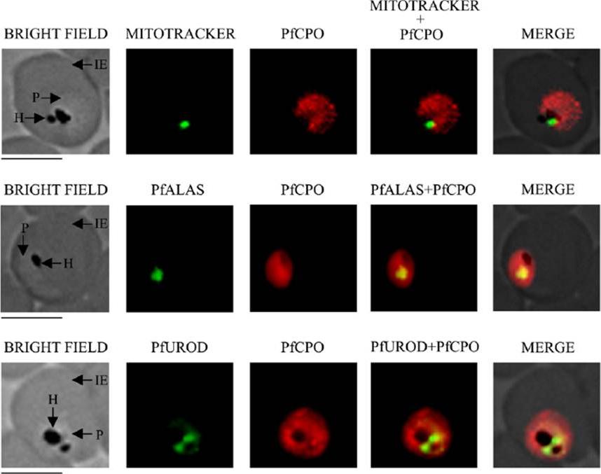 Localization of PfCPO by immunofluorescence microscopy. Localization of PfCPO with Mitotracker green (mitochondrial marker), PfALAS (mitochondrial marker) and PfUROD (apicoplast marker) was studied. IE, infected erythrocyte; P, parasite; H, hemozoin. Scale bar=5 μm. results presented in Fig. 4 indicate that the PfCPO signal was distributed throughout the parasite, but did not colocalize with that of Mitotracker dye (mitochondrial marker), PfALAS (mitochondrial marker) or PfUROD (apicoplast marker).Nagaraj VA, Prasad D, Arumugam R, Rangarajan PN, Padmanaban G. Characterization of coproporphyrinogen III oxidase in Plasmodium falciparum cytosol. Parasitol Int. 2010 59:121-127. Copyright Elsevier 2011