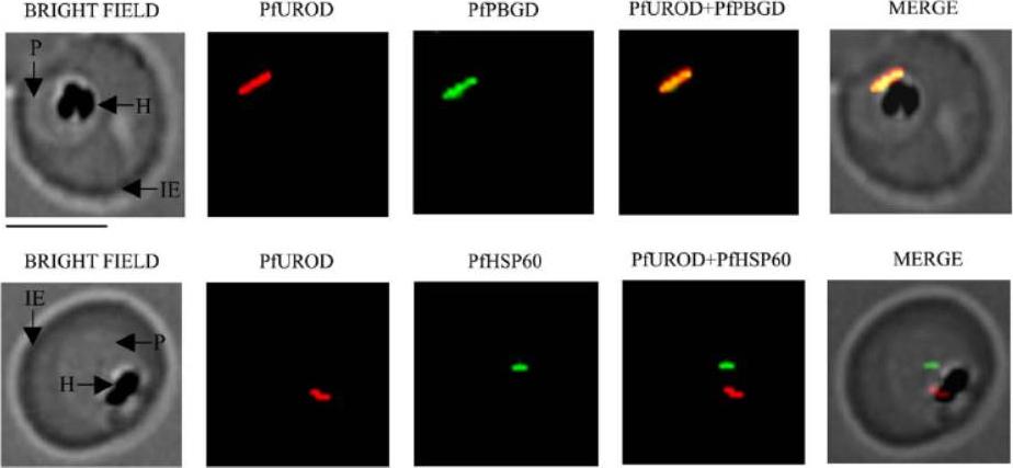 Localisation of parasite uroporphyrinogen decarboxylase (PfUROD) by immunofluorescence microscopy. Co-localisation of PfUROD with porphobilinogen deaminase (PfPBGD). Antibodies to recombinant, truncated uroporphyrinogen decarboxylase (r(D)PfUROD) were raised in mice, while PfPBGD and PfHSP60 PF10_0153 antibodies were from rabbit. To study co-localisation, tetramethylrhodamine isothiocyanate (TRITC)-conjugated goat anti-mouse IgG and FITC-conjugated goat antirabbit IgG were used. IE, infected erythrocyte; P, parasite; H, hemozoin. Scale bar = 5 mm. PfUROD co-localised with PfPBGD but not with PfHSP60 (a mitochondrial marker). Therefore, it can be concluded that PfUROD is localised in the apicoplast and not the mitochondrion.Nagaraj VA, Arumugam R, Chandra NR, Prasad D, Rangarajan PN, Padmanaban G. Localisation of Plasmodium falciparum uroporphyrinogen III decarboxylase of the heme-biosynthetic pathway in the apicoplast and characterisation of its catalytic properties. Int J Parasitol. 2009 39:559-68. Copyright Elsevier 2010.