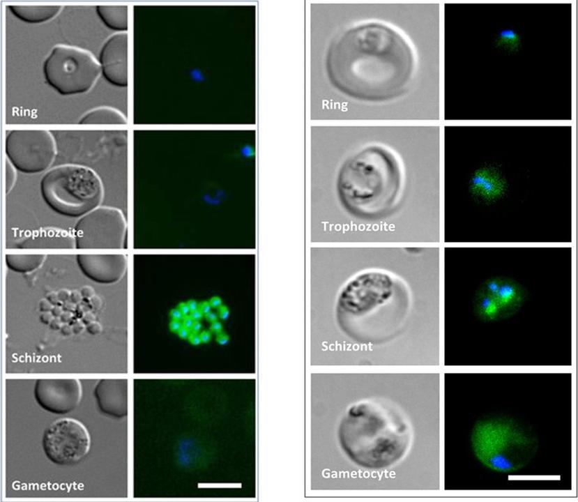 Left panel: Expression of DHHC2::GFP in live parasites. Scale bar = 5 μm. Live microscopy identified GFP+ asexual cells with a strong signal in schizonts and individual merozoites; no signal was evident from other asexual stage parasites or sexual stage parasites as expected from using the clag promoterRight panel: Expression of DHHC2::GFP in live dhhc2::gfp parasites. Scale bar = 5 μm Santos JM, Kehrer J, Franke-Fayard B, Frischknecht F, Janse CJ, Mair GR. The Plasmodium palmitoyl-S-acyl-transferase DHHC2 is essential for ookinete morphogenesis and malaria transmission. Sci Rep. 2015;5:16034