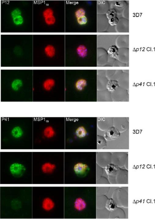 The genes for P12 and P41 can be disrupted and are therefore not essential for parasite growth. Immunofluorescence microscopy of Dp12 and Dp41 and parental 3D7 parasites probed with rabbit anti-P12 and anti-P41 IgGs in addition to the merozoite surface marker MSP1 mAb indicate absence of protein expression in the mutants aside from minor cross-reactivity.Taechalertpaisarn T, Crosnier C, Bartholdson SJ, Hodder AN, Thompson J, Bustamante LY, Wilson DW, Sanders PR, Wright GJ, Rayner JC, Cowman AF, Gilson PR, Crabb BS. Biochemical and Functional Analysis of Two Plasmodium falciparum Blood-Stage 6-Cys Proteins: P12 and P41. PLoS One. 2012;7(7):e41937.