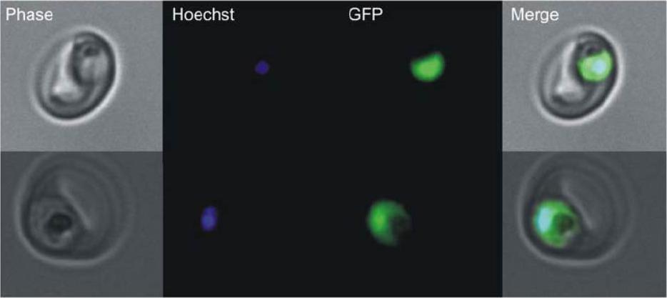 Localization of PfPdxK-GFP in living parasites by fluorescence microscopy. Fluorescence of the GFP moiety (green) is found in the parasite’s cytosol. The nucleus is stained with Hoechst dye (blue).Müller IB, Wu F, Bergmann B, Knöckel J, Walter RD, Gehring H, Wrenger C. Poisoning pyridoxal 5-phosphate-dependent enzymes: a new strategy to target the malaria parasite Plasmodium falciparum. PLoS ONE. 009;4(2):e4406.