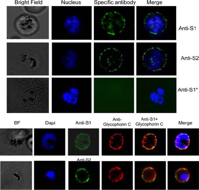 Location of native STEVOR at the iRBC surface. (A) Immunofluorescence assay of live 5A-infected erythrocytes with anti-S1 (upper row) and anti-S2 (middle row) antisera recognizing native STEVOR at the iRBC surface. Either anti-S1 or anti-S2 (lower row) did not react with trypsinized iRBC. The specific antibodies that reacted with the iRBC surface were detected with Alexa Fluor–labeled goat anti-rabbit IgG. Visualization of STEVOR surface antigens. Double staining of live 5A-iRBCs with either anti-S1 (or anti-S2) (panel i) with anti-Glycophorin C antibodies.Niang M, Yan Yam X, Preiser PR. The Plasmodium falciparum STEVOR Multigene Family Mediates Antigenic Variation of the Infected Erythrocyte. PLoS Pathog. 2009;5(2):e1000307. Epub 2009 Feb 20.