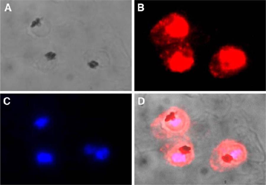 Immunolocalization of MDH in erythrocytes infected with Plasmodium falciparum. A Bright light image - infected and uninfected erythrocytes. B Red fluorescent image - distribution of MDH protein in the infected erythrocytes. C Blue fluorescent image - nucleus of malaria parasite stained with DAPI. D Merged image – shows cytoplasmic localization of MDH protein within the intraerythrocytic malaria parasites.Pradhan A, Mukherjee P, Tripathi AK, Avery MA, Walker LA, Tekwani BL. Analysis of quaternary structure of a [LDH-like] malate dehydrogenase of Plasmodium falciparum with oligomeric mutants. Mol Cell Biochem. 2009 325(1-2):141-8.