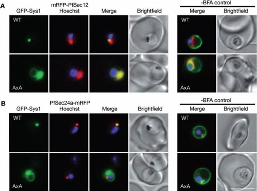 Brefeldin A (BFA) treatment causes retention of GFP-Sys1 at tER sites in an export signal dependent manner. Parasites coexpressing either GFP-Sys1DxE (WT) or GFP-Sys1AxA (AxA) with (A) mRFP-PfSec12 (from the calmodulin 5′ UTR) or (B) PfSec24a-mRFP were treated with 5 μg ml-1 BFA for 16 h prior to imaging. A merged image of a mock-treated control is shown for comparison. ER-retained GFP-Sys1AxA colocalized with PfSec12 throughout the ER (A), whereas GFP-Sys1DxE was enriched at tER sites coincident with PfSec24a (B). Bar = 5 μm.Lee MC, Moura PA, Miller EA, Fidock DA. Plasmodium falciparum Sec24 marks transitional ER that exports a model cargo via a diacidic motif. Mol Microbiol. 2008 68(6):1535-46.
