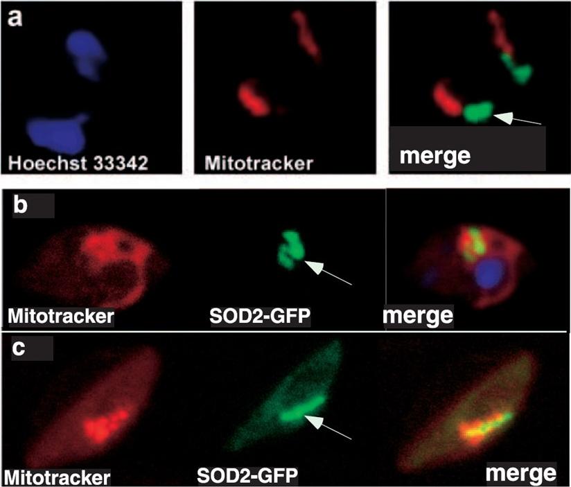 PfSOD2 Is Targeted to the Apicoplast in the Intra-ErythrocyticStages of P. falciparum. IFA on live erytrocytes infected with transgenic P. falciparum parasites expressing PfSOD2GFP. The construct starts either at the second methionine ( MNLKIL. . .) and is controlled by the PfCRT promoter (panel a), or at he first methionine (MLYKLY. . .) and is controlled by the PfSOD2 promoter (panel b). The mitochondrion is labeled in red with MitoTracker and the localization PfSOD2-GFP to the apicoplast is detected in green. The same construct was stably expressed in the strain 3D7 and the same results were observed. Moreover, PfSOD2 was also shown to localize to the apicoplast only in the gametocytes (panel c). The arrows indicate the apicoplast.Pino P, Foth BJ, Kwok LY, Sheiner L, Schepers R, Soldati T, Soldati-Favre D. Dual targeting of antioxidant and metabolic enzymes to the mitochondrion and the apicoplast of Toxoplasma gondii. PLoS Pathog. 2007 3(8):e115.