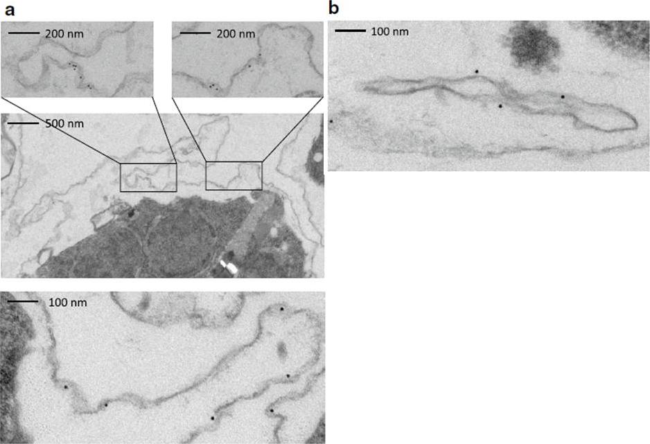 Immunoelectron microscopy of saponin permeabilized IE to confirm PfMC-2TM presence at the erythrocyte membrane. a, b A preembedding staining protocol was applied to analyse PfMC-2TM membrane association by immunoelectron microscopy. Trophozoite IE were permeabilized with saponin and incubated with the immune serum rabbit α-PfMC-2TM-CT (I) or the respective pre-immune serum (PI). Recognized proteins are visualized with 10 nm gold particles. Different sections are shown depicting PfMC-2TM association with the erythrocyte membrane (a) and with Maurer’s clefts (b).Bachmann A, Scholz JA, Janßen M, Klinkert MQ, Tannich E, Bruchhaus I, Petter M. A comparative study of the localization and membrane topology of members of the RIFIN, STEVOR and PfMC-2TM protein families in Plasmodium falciparum-infected erythrocytes. Malar J. 2015 Jul 14:274.