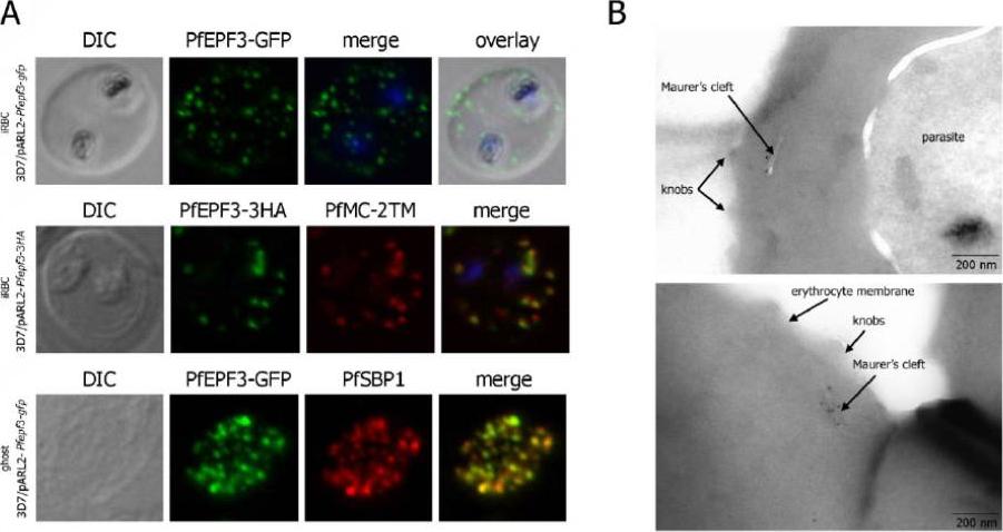 Localization and topology of the PfEPF3 proteins. A. Fluorescent patterns of iRBCs infected by 3D7/pARL2-Pfepf3-gfp (live imaging) and 3D7/pARL2-Pfepf3-3HA (immunodetection using anti-HA antibodies, in green, and anti-PfMC-2TM antibodies, in red) and of resealed ghosts from 3D7/pARL2-Pfepf3-gfp iRBCs (GFP fluorescence, in green, and immunodetection using anti-SBP1 antibodies, in red). RBCs and ghost preparations were incubated with DAPI for nucleus labelling. B. Immunoelectron microscopy using anti-GFP antibodies.Mbengue A, Audiger N, Vialla E, Dubremetz JF, Braun-Breton C. Novel Plasmodium falciparum Maurer's clefts protein families implicated in the release of infectious merozoites. Mol Microbiol. 2013 88(2):425-42 PMID: .