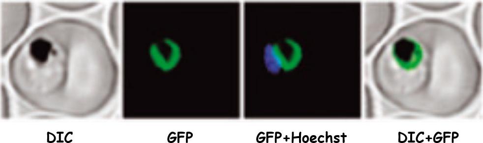 Full-length PfCRT fused to the green fluorescent protein (GFP). Confocal laser scanning microscopy of parasites expressing PfCRTfull revealed a fluorescence signal surrounding the malaria pigment, consistent with a localization of the corresponding protein at the digestive vacuolar membrane. First column, differential interference contrast (DIC); second column, GFP; third column, GFP and nuclear staining with Hoechst; fourth column overlay of green and DIC channel. Scale bar = 4 mm.Kuhn Y, Sanchez CP, Ayoub D, Saridaki T, van Dorsselaer A, Lanzer M. Trafficking of the phosphoprotein PfCRT to the digestive vacuolar membrane in Plasmodium falciparum. Traffic. 2010 11:236-49. Copyright John Wiley & Sons Ltd. 2010.
