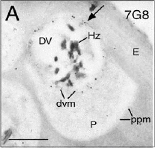 Immunoelectron microscopy was performed using affinity-purified anti-PfCRT antibodies. Representative micrographs are shown for each parasite line. Bars correspond to 0.25 mm. Arrowheads indicate immunogold-labeled PfCRT deposits on the digestive vacuole membrane (dvm). DV, digestive vacuole; E, erythrocyte; Hz, hemozoin; P, parasite; ppm, parasite plasma membrane. Waller KL, Muhle RA, Ursos LM, Horrocks P, Verdier-Pinard D, Sidhu AB, Fujioka H, Roepe PD, Fidock DA. Chloroquine resistance modulated in vitro by expression levels of the Plasmodium falciparum chloroquine resistance transporter. J Biol Chem. 2003 278:33593-601.
