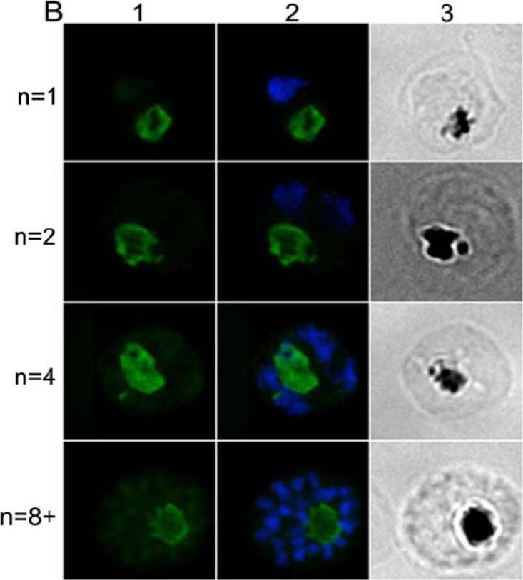 IFA location of CRT in mature parasites at different stages of nuclear division. Each row in panel B shows an identical field from 1% formaldehyde-fixed thin smears of late-stages parasites at the 1-, 2-, 4-, and 8-nuclei stage. Panel B1 shows rabbit anti-CRT antibody labeling (the secondary antibody was Alexa Fluor 488-conjugated anti-rabbit IgG antibody (green). Panel B2 shows the same fields merged with the corresponding DAPI stained nucleus images (blue). Panel B3 shows the same fields visualized by light microscopy - note the pigment is clearly visible. Rabbit-anti-CRT antiobody is clearly detectable throughout parasite maturation and is associated with the food vacuole.Dluzewski AR, Ling IT, Hopkins JM, Grainger M, Margos G, Mitchell GH, Holder AA, Bannister LH. Formation of the food vacuole in Plasmodium falciparum: a potential role for the 19 kDa fragment of merozoite surface protein 1 (MSP1(19)). PLoS ONE. 2008 Aug 3(8):e3085. ™