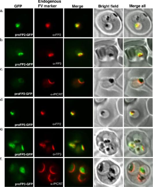 Co-localization of full-length prodomain constructs with endogenous food vacuole proteins. Trophozoites transfected with proFP2-GFP (under falcipain-2 promoter) (a–c) or proFP3-GFP (under HSP86 promoter) (d–f) constructs were processed for immunofluorescence microscopy and labeled with anti-FP2 (a,d), anti-FP3 (b, e), or anti-PfCRT.Subramanian S, Sijwali PS, Rosenthal PJ. Falcipain cysteine proteases require bipartite motifs for trafficking to the Plasmodium falciparum food vacuole. J Biol Chem. 2007 282(34):24961-9.