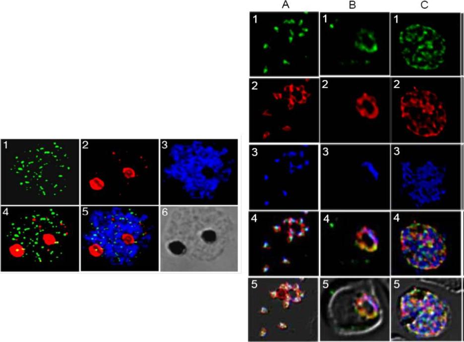 Right panel: Expression and localization of PfMRP within asexual stages of the W2 parasite. 1 (green, anti-PfMRP; 2 (red), anti-PfMSP-1 (PFI1475w); 3 (blue), DAPI dye; 4, merged 1-3; 5, merged 1-4 and diffrential interference contrast (DIC). A, free merozoites; B, a trophozoite; C, a schizont. In merozoites, PfMRP was expressed in membrane-bound vesicles located inside the parasite plasma membrane and did not co-localize with PfMSP-1 on plasma membrane. In trophozoite and schizont stages, PfMRP expression increased with parasite growth, located on an extensive network of membrane structures including plasma membrane although it appeared to be present in ‘patches’. Left panel: Immunofluorescent assay (IFA) localization of PfMRP and PfCRT in mature schizonts and merozoites. 1, anti-PfMRP; 2, anti-PfCRT, staining food vacuoles; 3, DAPI; 4, merged images of 1 and 2; 5, merged image of 1-3; and 6, differential interference contrast (DIC).Raj DK, Mu J, Jiang H, Kabat J, Singh S, Sullivan M, Fay MP, McCutchan TF, Su XZ. Disruption of a Plasmodium falciparum multidrug resistance-associated protein (PFMRP) alters its fitness and transport of antimalarial drugs and glutathione. J Biol Chem. 2008 284(12):7687-96.