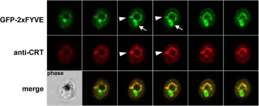 GFP fluorescence in parasites expressing GFP-2xFYVE. This construct has been used in various organisms to monitor the intracellular localization of PI3P. Colocalization of GFP-2xFYVE and the food vacuole membrane marker CRT using rabbit anti-CRT. Serial images of a Z-stack acquisition (0.38 mm step) are displayed. Arrowheads indicate protrusions from the food vacuole membrane that are colabeled with CRT and GFP-2xFYVE, while arrows indicate zones of intense GFP-2xFYVE staining in the absence of the food vacuole marker. A corresponding phase-contrast image is shown in the lower left corner. Fluorescence was associated mainly with the membrane of the food vacuole.Tawk L, Chicanne G, Dubremetz JF, Richard V, Payrastre B, Vial HJ, Roy C, Wengelnik K. Phosphatidylinositol 3-phosphate, an essential lipid in Plasmodium, localizes to the food vacuole membrane and the apicoplast. Eukaryot Cell. 2010 9:1519-30.