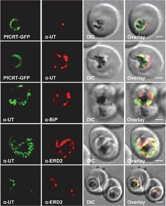 Subcellular localization of PfUT (ubiquitin-transferase). P. falciparum-infected erythrocytes at the trophozoite stage were fixed and analyzed by immunofluorescence assays using antisera to the ER marker BiP (rabbit, 1:1000), the Golgi marker ERD2 (rat, 1:500), and the N- (panels 1 and 5, rabbit, 1:3000; panel 3, mouse, 1:2000) and C-terminal domains of PfUT (panels 2 and 4, rabbit, 1:3000). Panel 1 shows a late ring stage parasite, the other panels show trophozoites. GFP fluorescence was detected, by confocal fluorescence microscopy, in parasites expressing episomally a PfCRT/GFP fusion protein. The different antisera raised against PfUT showed comparable results. Bar, 2 mm. Immunofluorescence microscopy partially co-localized PfUT with the ER marker BiP and the Golgi marker ERD2, but not with PfCRT.Sanchez CP, Liu CH, Mayer S, Nurhasanah A, Cyrklaff M, Mu J, Ferdig MT, Stein WD, Lanzer M. A HECT Ubiquitin-Protein Ligase as a Novel Candidate Gene for Altered Quinine and Quinidine Responses in Plasmodium falciparum. PLoS Genet. 2014 10(5):e1004382.