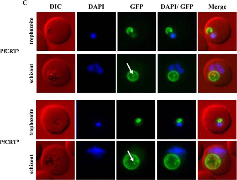 Over-expression of sensitive and resistant form of PfCRT as GFP-fusion protein. Fluorescence microscopy of GFP-fusions of sensitive (PfCRTS, top) and resistant (PfCRTR, bottom) form of PfCRT. PfCRTS and PfCRTR were over-expressed as GFP-fusion proteins using an ATc-inducible expression system. Live cell images of DAPI-stained infected red blood cells show that both forms of PfCRT localise to the FV membrane. Later stages of the asexual life cycle show ring/dot-like structures (white arrow) within the FV, possibly degraded GFP-fusion proteins.Ehlgen F, Pham JS, de Koning-Ward T, Cowman AF, Ralph SA. Investigation of the Plasmodium falciparum food vacuole through inducible expression of the chloroquine resistance transporter (PfCRT). PLoS One. 2012;7(6):e38781.