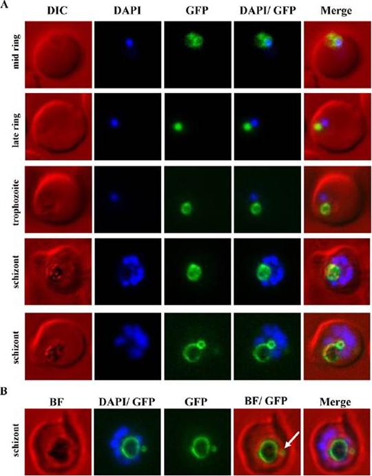 Immunofluorescence images of PfMRP2 localization labelled with Alexa488 during the development from ring to trophozoite and schizont stages in the wild-type clone 11C parasite. Nucleus was stained with DAPI (4′,6′-diamidino-2-phenylindole). The bottom panel shows dual labelling of the parasite at early schizont stage with anti-PfMRP2 (Alexa488) antibody and digestive vacuole-specific PfCRT antibody (Alexa594). In all asexual blood stages of 11C/wt, the PfMRP2 IFAsignal exhibited a punctate pattern suggesting its association with membranous vesicles within the parasite cytoplasm. In the ring stage, PfMRP2-associated compartments concentrated to the periphery of the parasite, while in trophozoite and schizont stages these were more dispersed throughout the cytoplasm. The signal also appeared discrete and punctuated around individual merozoites in the mature schizonts just prior to rupture.Mok S, Liong KY, Lim EH, Huang X, Zhu L, Preiser PR, Bozdech Z. Structural polymorphism in the promoter of pfmrp2 confers Plasmodium falciparum tolerance to quinoline drugs. Mol Microbiol. 2014 91(5):918-34.