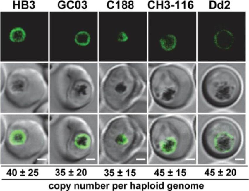 Live cell images of the P. falciparum strains indicated expressing an episomal copy of the Dd2 form of pfcrt fused to the GFP coding sequence. Fluorescence is located at the digestive vacuolar membrane, consistent with previous reports. Bar, 2 mM. The copy number of the plasmid per haploid genome is indicated. The means 6 SEM of at least 6 biological replicates are shown. The copy numbers are not statistically different in the transfectants. In all cases, the PfCRT/GFP fusion protein was expressed and localized at the membrane of the parasite’s digestive vacuole.Sanchez CP, Liu CH, Mayer S, Nurhasanah A, Cyrklaff M, Mu J, Ferdig MT, Stein WD, Lanzer M. A HECT Ubiquitin-Protein Ligase as a Novel Candidate Gene for Altered Quinine and Quinidine Responses in Plasmodium falciparum. PLoS Genet. 2014 10(5):e1004382.