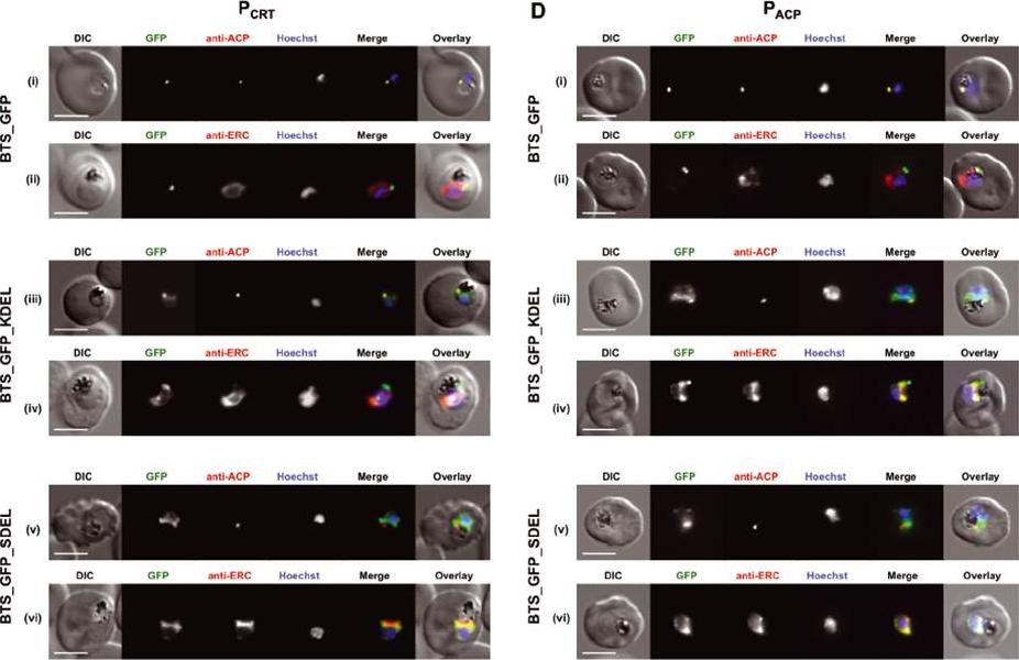 Addition of ER retrieval sequences to an apicoplast-targeted protein leads to reduced delivery to the apicoplast. A and C) Live-cell imaging of parasites expressing the apicoplast leader sequence of ACP (BTS) fused to GFP (top panel), GFP_KDEL (middle panel) and GFP_SDEL (both KDEL and SDEL are ER retention sequences; lower panel) under control of either the PfCRT (PCRT) or PfACP (PACP) promoter. B and D) Immunofluorescence assay of parasites expressing the apicoplast leader BTS fused to GFP (i, ii), GFP_KDEL (iii, iv) and GFP_SDEL (v, vi) as described above with anti-PfACP (apicoplast marker) and anti-PfERC (ER marker) antibodies. Scale bar: 3 μm (all).Heiny SR, Pautz S, Recker M, Przyborski JM. Protein Traffic to the Plasmodium falciparum Apicoplast: Evidence for a Sorting Branch Point at the Golgi. Traffic. 2014 15(12):1290-304