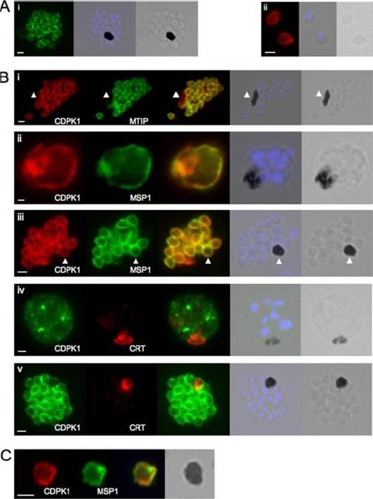 CDPK1 localizes to the plasma membrane of merozoites. A, an anti-CDPK1 antibody detects CDPK1 at the parasite periphery in schizonts (panel i) and free merozoites (panel ii). The second panel shows a merged image of nuclear staining with 4’,6’-diamino-2-phenylindole (blue) and the bright field image, and the third panel shows the bright field image. B, panel i, CDPK1 colocalizes with MTIP around the periphery of merozoites but is also found around the residual body, marked with an arrowhead, from which MTIP is absent. In young (panel ii) and segmented (panel iii) schizonts, CDPK1 colocalizes with the plasma membrane marker MSP1. Both proteins are also detected around the residual body, marked with an arrowhead. CDPK1 does not colocalize with the food vacuole marker PfCRT in either immature (panel iv) or mature (panel v) schizonts. The third panels in all of the images show the merged images of the antibody staining, beside which is a merged image of the bright field image and the nuclei of the parasites stained with 4’,6’-diamino-2-phenylindole (blue), followed by the bright field image alone. C, both CDPK1 (red) and MSP1 (green) can be detected on residual bodies that are released upon schizont rupture. The merged images of the antibody staining are shown in the third panels, followed by the bright field image. In all cases the white scale bar in the first panel of each set of images represents 1 mm.Green JL, Rees-Channer RR, Howell SA, Martin SR, Knuepfer E, Taylor HM, Grainger M, Holder AA. The motor complex of Plasmodium falciparum: phosphorylation by a calcium-dependent protein kinase. J Biol Chem. 2008 7;283(45):30980-9. PMID: