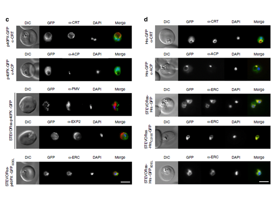 (c) p40PX-GFP localizes to the cytoplasm and to membranes of the food vacuole (labelled with anti-CRT) and apicoplast (labelled with anti-ACP). STEVORss-p40PX-GFP localizes to the PV in P. falciparum-infected erythrocytes, as shown by co-localization with anti-EXP2, and not in the ER, which was labelled with anti-PMV. If PI(3)P was located within the ER, this chimera would be expected to remain within the ER via p40PX binding. Fusion to an ER-retention signal (STEVORss-p40PX-GFPSDEL) retains the protein in ER, co-localization with anti-ERC. Scale bar, 5 mm.(d) Localization of Hrs-GFP to the cytoplasm and membranes of food vacuole (labelled anti-CRT) and apicoplast (labelled anti-ACP). STEVORss-Hrs-GFP localizes to the ER as shown by co-localization with anti-ERC; however, mutation of residues necessary for lipid binding in both Hrs FYVE fingers (STEVORss-HrsC215S-GFP) does not abrogate ER localization, demonstrating PI(3)P-independent retention in ER. Addition of ER retention signal (STEVORss-Hrs-GFPSDEL) also causes ER localization. Scale bar, 5 mm. Boddey JA, O'Neill MT, Lopaticki S, Carvalho TG, Hodder AN, Nebl T, Wawra S,van West P, Ebrahimzadeh Z, Richard D, Flemming S, Spielmann T, Przyborski J,Babon JJ, Cowman AF. Export of malaria proteins requires co-translationalprocessing of the PEXEL motif independent of phosphatidylinositol-3-phosphatebinding. Nat Commun. 2016 Feb 1;7:10470.