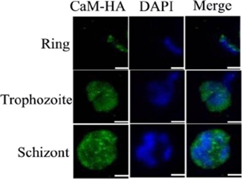Detection of CaM via immunofluorescence in intraerythrocytic stages with anti-HA and anti-IgG rabbit Alexa 488 (green). Nucleus was stained with DAPI (blue). Confocal images are shown as the maximum projection of stacks. Scale bars are of 2 μm. The immunofluorescence in CaM-Str-HA parasites indicated that the distribution of CaM is consistent with that of a cytosolic protein.Budu A, Gomes MM, Melo PM, El Chamy Maluf S, Bagnaresi P, de Azevedo MF, Carmona AK, Gazarini ML. Calmidazolium evokes high calcium fluctuations in Plasmodium falciparum. Cell Signal. 2015 Dec 9. [Epub ahead of print]