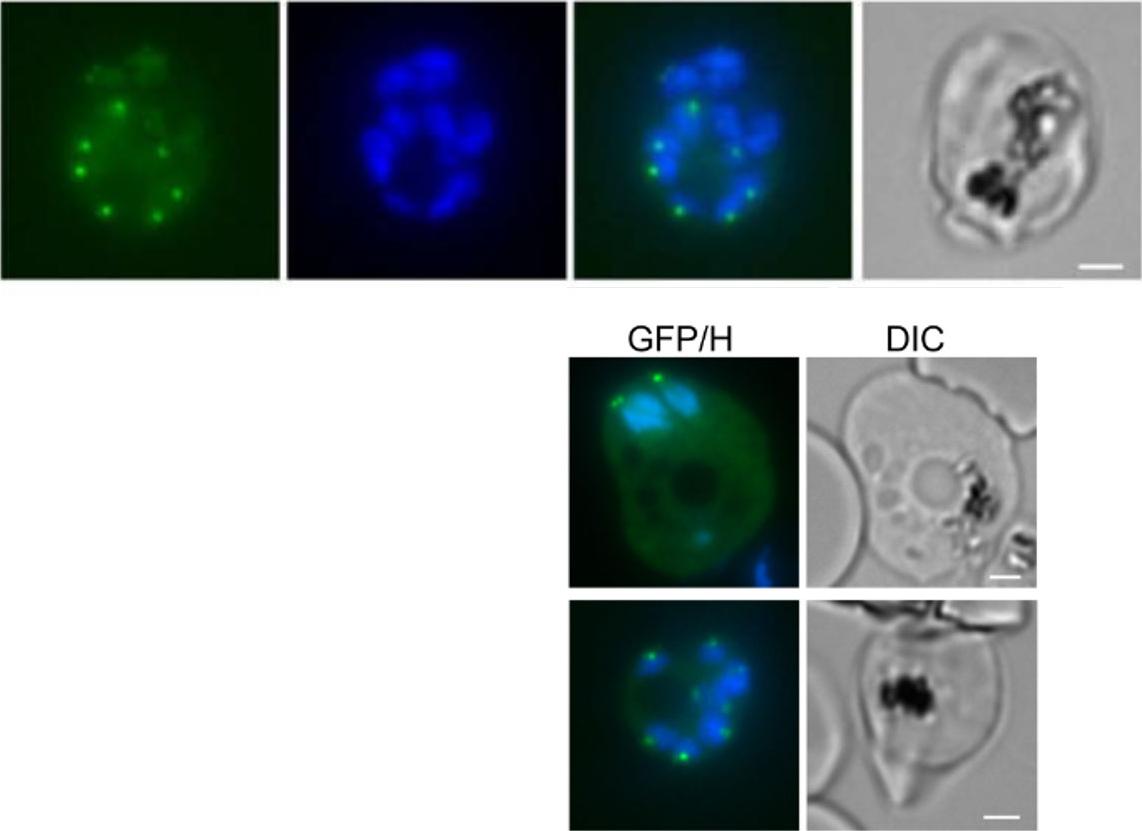 Episomal expression of GFP-tagged Pfnek-4 protein multinucleated-schizont stage from transgenic 3D7 parasites expressing GFP-tagged Pfnek-4 controlled by cognate (Pfnek-4) promoter. Overlay between the green and blue channels, and corresponding DIC images are shown as well. Scale bars, 2.0 μm. While the bulk of examined schizonts did not show any detectable signal, as expected for a protein thought to be gametocyte-specific, fluorescence microscopy of asexual stage cultures consistently identified a small subpopulation of schizonts with dots (single or doublets) of concentrated Pfnek-4-GFP protein associated with nuclei. Fluorescence was never detected in ring and trophozoite stages. Noteworthy, all nuclei within a single schizont appeared to be associated with punctuate Pfnek-4-GFP fluorescence from early developing schizont to multinucleated schizonts (right). Reininger L, Garcia M, Tomlins A, Müller S, Doerig C. The Plasmodium falciparum, Nima-related kinase Pfnek-4: a marker for asexual parasites committed to sexual differentiation. Malar J. 2012 Jul 31;11(1):250.