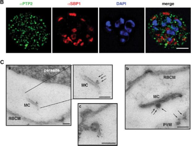 Localization of PfPTP2 in CS2idhfrPTP2/HA-infected RBCs. (B) First panel, PfPTP2 (green); second panel, SBP1 (Maurer’s cleft marker; red); third panel, DAPI (blue); fourth panel, all panels merged. (C) Immuno-EM of CS2idhfrPTP2/HA-infected RBCs after treatment with equinotoxin II. MC, Maurer’s cleft; RBCM, red blood cell plasma membrane; PVM, parasitophorous vacuole membrane. a, the side panel shows higher magnification of Maurer’s cleft; arrows point to budding vesicle where PfPTP2 is localized. b, arrows point to PfPTP2 on budding vesicle and membrane material. c, an example of budding vesicle with PfPTP2 localization. PfPTP2-labeled material in host cell cytoplasm was derived from Maurer’s clefts .Regev-Rudzki N, Wilson DW, Carvalho TG, Sisquella X, Coleman BM, Rug M, Bursac D, Angrisano F, Gee M, Hill AF, Baum J, Cowman AF. Cell-Cell Communication between Malaria-Infected Red Blood Cells via Exosome-like Vesicles. Cell. 2013 May 23;153(5):1120-33.
