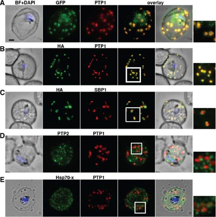 PfPTP1 is localised on Maurer’s clefts in P. falciparum-infected RBCs. (A) Immunofluorescence assay on CS2/PfPTP1-GFP cell line: the GFP signal (green) colocalises with that of the endogenous protein (PfPTP1; red); inset: enlargement of colocalisation pattern. (B) Immuno-fluorescence assay on CS2/PfPTP1-HA cell line: the HA signal (green) colocalises with the α-PfPTP1 signal (red); inset: enlargement of colocalisation pattern. (C) Immunofluorescence assay on CS2/PfPTP1-HA cell line: the HA-signal (green) colocalises partially with the MC resident protein SBP1 (red); inset: enlargement of colocalisation pattern. (D) Immunofluorescence assay on CS2 parental cell line: the PfPTP2-signal (green) does not overlap with the PfPTP1-signal (red); inset: enlargement of area where MC (PfPTP1) and electron dense vesicles (PfPTP2) are in close proximity. (E) Immunofluorescence assay on CS2 parental cell line: the PfHsp70-x-signal (green) colocalises partially with the PfPTP1- signal (red); inset: enlargement of partial colocalisation on J-Dots (PfHsp70-x). Scale bar: 1μm; same size of ROI in each image. Rug M, Cyrklaff M, Mikkonen A, Lemgruber L, Kuelzer S, Sanchez CP, Thompson J, Hanssen E, O'Neill M, Langer C, Lanzer M, Frischknecht F, Maier AG, Cowman AF. Export of virulence proteins by malaria-infected erythrocytes involves remodelling of host actin cytoskeleton. Blood. 2014 Aug 19 [Epub ahead of print]