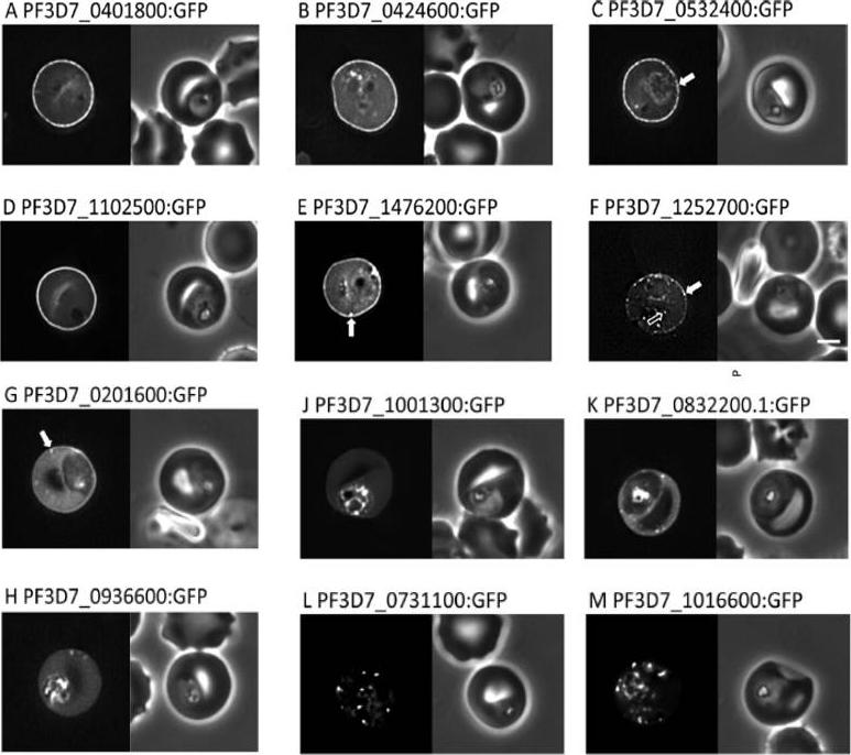 Localisation of PHIST:GFP proteins. The left- and right-hand images show GFP localisation and a phase contrast image, respectively. White filled arrows: peripheral GFP puncta; White unfilled arrow: GFP puncta in host erythocyte cytosol. Scale bar, 2 mm. GFP-tagged PF3D7_0401800, PF3D7_0424600, PF3D7_0532400, PF3D7_1102500 and PF3D7_1476200 were all exported to the host cell and displayed a striking localisation at the edge of the host erythrocyte (1A–E), PF3D7 1252700 was clearly peripheral in the host erythrocyte (F). PF3D7_0201600 (G) shows weak accumulation at the erythrocyte periphery, but the majority of the protein was localised in the RBC cytosol. PF3D7_0936600 was localised in the erythrocyte cytosol, not at the host cell periphery (H).Tarr SJ, Moon RW, Hardege I, Osborne AR. A conserved domain targets exported PHISTb family proteins to the periphery of Plasmodium infected erythrocytes. Mol Biochem Parasitol. 2014 196(1):29-40