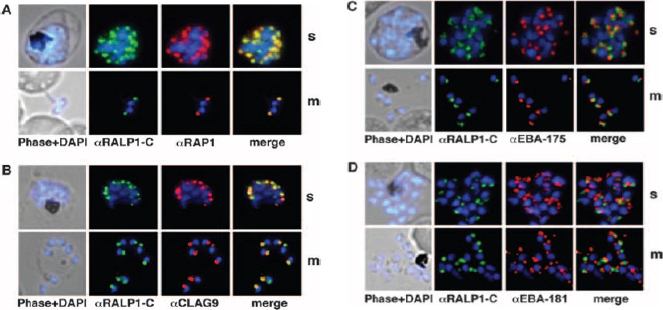 Colocalization studies of RALP1 with rhoptry and microneme marker proteins. (A and B) RALP1-C-specific antibodies (green) colocalize with the rhoptry protein RAP1 (red) (A) and predominantly colocalize with CLAG9 a rhoptry-specific marker, (red) (B) in fixed schizonts (s) and free merozoites (m) using RAP1- and CLAG9-specific antibodies, respectively. (C and D) RALP1-C-specific antibodies (green) visualize a different compartment within the parasite than the microneme marker proteins EBA-175 (red) (C) and EBA-181 (red) (D), as is evident in the merge of the two fluorescence photomicrographs. Nuclei were stained blue (DAPI).Haase S, Cabrera A, Langer C, Treeck M, Struck N, Herrmann S, Jansen PW, Bruchhaus I, Bachmann A, Dias S, Cowman AF, Stunnenberg HG, Spielmann T, Gilberger TW. Characterization of a conserved rhoptry-associated leucine zipper-like protein in the malaria parasite Plasmodium falciparum. Infect Immun. 2008 76:879-87.
