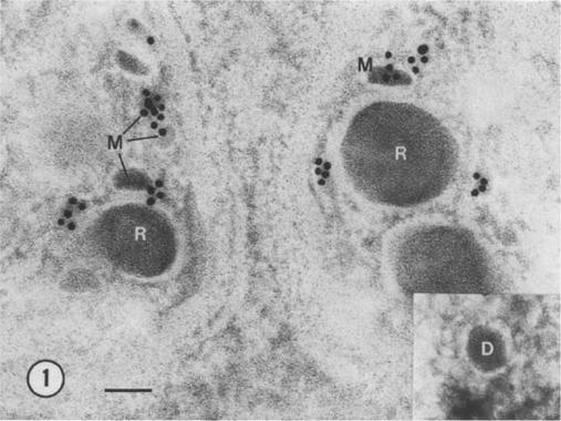 lmmunoelectron micrograph showing the presence of EBA-peptide 4 in micronemes (M) of P. falciparum merozoites. No gold particles are seen associated with rhoptries (R). Insert: dense granule (D) without gold particles. Bar = 100 nm.Sim BK, Toyoshima T, Haynes JD, Aikawa M. Localization of the 175-kilodalton erythrocyte binding antigen in micronemes of Plasmodium falciparum merozoites. Mol Biochem Parasitol. 1992 51:157-9. Copyright Elsevier 2010.
