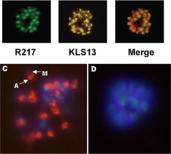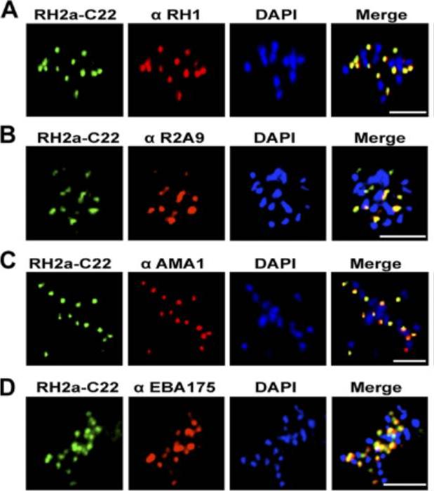 Dual immunofluorescent analyses showing apical staining of mature P. falciparum (FVO strain) schizont with EBA-175 RII specific mAb R217 used at 10 mg/mL and rabbit polyclonal sera KLS13 against baculovirus expressed EBA-175 RII. These mAbs gave a characteristic apical punctate fluorescence pattern in late stage schizonts.C) Schizont stained with mAb R217 (used at 2.34 mg/mL), M: merozoite; A: apical end of the merozoite expressing EBA175, D) schizont stained with anti-PfCSP mAb 2A10 (used at 68 mg/mL). The nuclei were stained with DAPI. Sim BK, Narum DL, Chattopadhyay R, Ahumada A, Haynes JD, Fuhrmann SR, Wingard JN, Liang H, Moch JK, Hoffman SL. Delineation of stage specific expression of Plasmodium falciparum EBA-175 by biologically functional region II monoclonal antibodies. PLoS One. 2011 Apr 14;6(4):e18393.