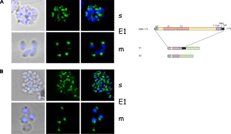 Localization of EBA-175 GFP by fluorescence microscopy in unfixed parasites. A and B, using fluorescence of the GFP reporter protein E1 and E2 distribution (green) is restricted to the apical pole within the parasite. The nucleus is stained with DAPI (blue). EBA-175 is localized in micronemes.Treeck M, Struck NS, Haase S, Langer C, Herrmann S, Healer J, Cowman AF, Gilberger TW. A conserved region in the EBL proteins is implicated in microneme targeting of the malaria parasite Plasmodium falciparum. J Biol Chem. 2006 281:31995-2003.