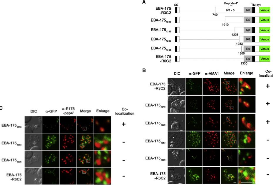 IFA detection of parasites expressing serially truncated recombinant EBA-175. (A) Schematic structures of recombinant EBA-175 proteins; EBA-175-R3C2, EBA-1751010, EBA-1751236, EBA-1751283, EBA-1751306 or EBA-175-R6C2. Signal sequence (SS), regions 1 to 6 (R1, R2, R3–5 and R6), transmembrane region (TM) and cytoplasmic tail (cyt) are indicated. Bar above the scheme indicates the target region of anti-EBA-175-pep4′ antibody (aa 1089–1108). (B and C) Parasites were stained with anti-GFP (α-GFP, green) and anti-AMA1 (panel B; α-AMA1, red) or anti-EBA-175-pep4′ (panel C; α-E175-pep4′, red). Scale bar indicates 2 μm. DIC is a differential interference contrast image. Status of the co-localization with a microneme marker is shown at the right side of each row. (+) or (−) indicate that two signal co-localized or not co-localized.Sakura T, Yahata K, Kaneko O. The upstream sequence segment of the C-terminal cysteine-rich domain is required for microneme trafficking of Plasmodium falciparum erythrocyte binding antigen 175. Parasitol Int. 2012 62(2):157-64